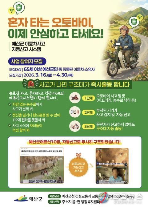 전국연합뉴스 김용태 기자 | 예산군은 이륜차사고 발생 시 자동 신고를 통해 신속한 구조를 지원하는 ‘이륜차사고 자동신고 시스템 운영’ 사업을 추진한다.