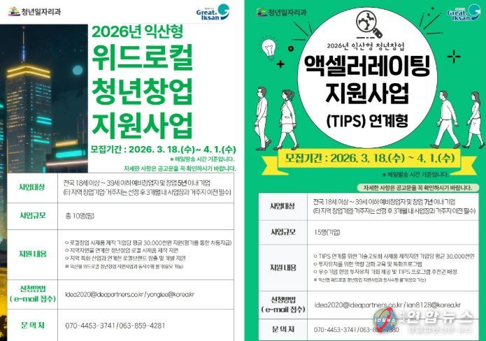 익산시는 '2026년 익산형 위드로컬 청년창업 지원사업'과 '2026년 익산형 청년창업 액셀러레이팅 지원사업(TIPS 연계형)' 참여자를 오는 4월 1일까지 모집한다고 20일 밝혔다.