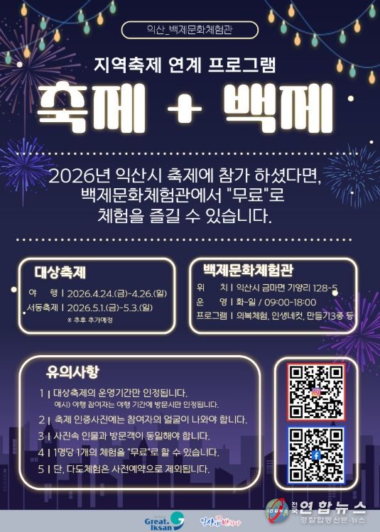 익산시 관계자는 "익산의 대표 축제를 찾은 방문객들이 보다 폭넓게 지역을 즐길 수 있도록 이벤트를 마련했다"며 "앞으로도 다양한 자원을 연계해 체류형 관광 콘텐츠를 지속 확대하겠다"고 말했다.