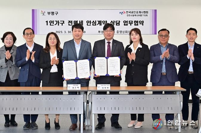 전국연합뉴스 박말출 기자 | 인천시 부평구는 30일 구청 영상회의실에서 한국공인중개사협회 인천시 부평구지회와 1인 가구 전월세 안심계약 상담서비스를 운영하기 위한 업무협약을 체결했다.