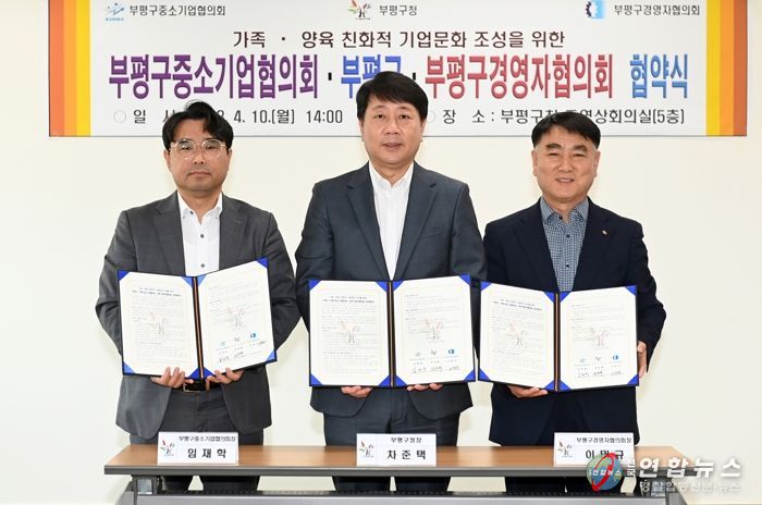 전국연합뉴스 박말출 기자 | 부평구는 지난 10일 구청 중영상회의실에서 부평구 중소기업협의회 및 경영자협의회와 가족·양육 친화적 기업문화 조성을 위한 업무협약을 체결했다.
