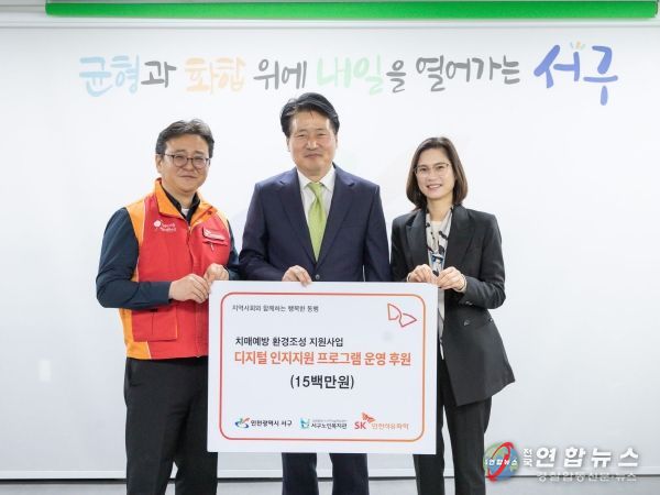 전국연합뉴스 박말출 기자 | 인천 서구는 19일 SK인천석유화학가 치매예방을 위한 디지털 인지지원 프로그램 지원금 1천500만원을 전달했다고 밝혔다.