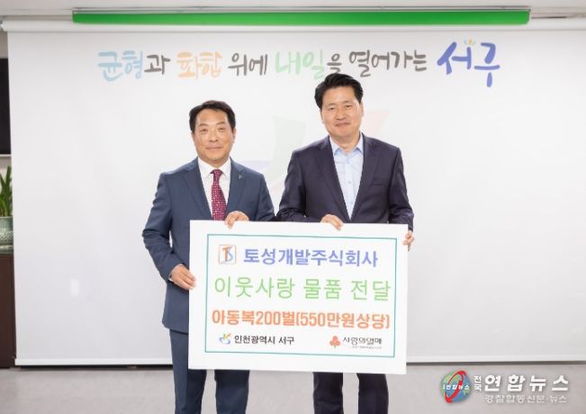 전국연합뉴스 박말출 기자 | 인천시 서구는 1일 토성개발주식회사가 가정의 달을 맞아 저소득가정 아동을 위한 아동복 200벌을 후원했다고 밝혔다.