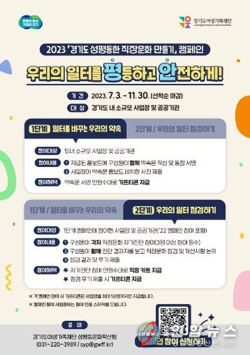 전국연합뉴스 조민준 기자 | 경기도여성가족재단이 성평등한 직장문화 조성을 위해 소규모 사업장과 공공기관을 대상으로 ‘2023 경기도 성평등한 직장문화 만들기’ 캠페인을 펼친다.