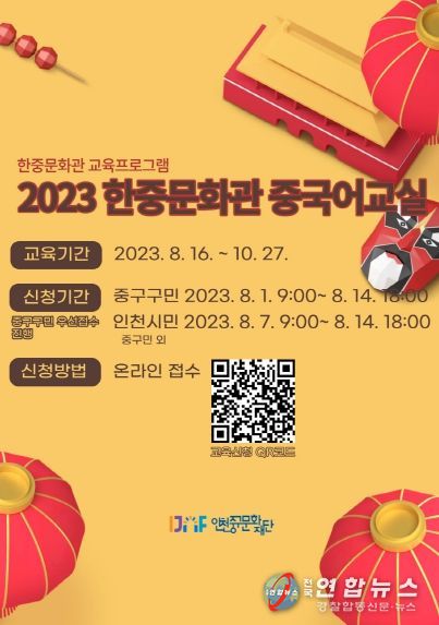 전국연합뉴스 김광원 기자 | (재)인천중구문화재단은 한중문화관 활성화 사업의 일환으로 8월 16일부터 오는 10월 27일까지 '2023 한중문화관 중국어교실'을 운영한다.