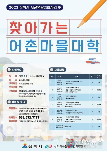 전국연합뉴스 권찬규 기자 | 삼척시와 삼척시공동체종합지원센터는 해양수산부 일반농산어촌개발사업 시군역량강화사업의 일환으로 ‘찾아가는 어촌마을 대학’을 운영한다.