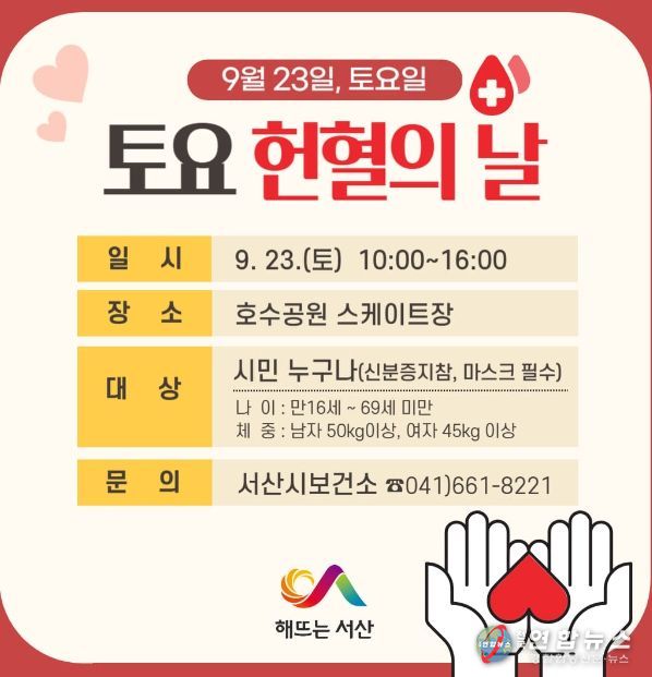 전국연합뉴스 김용태 기자 | 충남 서산시와 대한적십자사 대전‧세종‧충남 혈액원은 9월 23일 토요일 오전 10시부터 오후 4시까지 서산시 호수공원주차장에서 ‘토요 헌혈의 날’을 실시한다고 밝혔다.