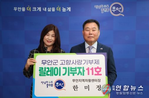 전국연합뉴스 김철환 기자 | 전남 무안군은 고향사랑기부제의 성공적인 안착과 조기 활성화를 위해 추진하고 있는 ‘무안군 고향사랑기부 릴레이’에 무안지역자활센터 한미정 센터장이 지난 22일 11호로 참여했다.