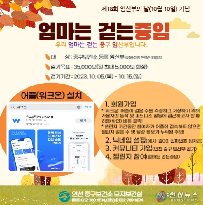 전국연합뉴스 김광원 기자 | 인천시 중구는 제18회 임산부의 날(10월 10일)을 기념해 임산부 걷기 챌린지 ‘엄마는 걷는중임(우리 엄마는 걷는 중구 임산부입니다)’을 운영한다고 11일 밝혔다.