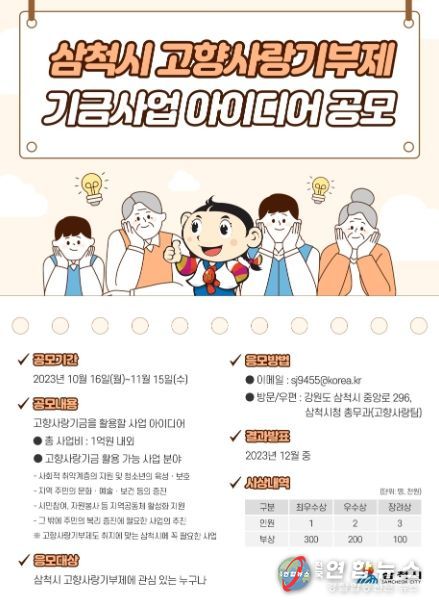 전국연합뉴스 권찬규 기자 | 삼척시는 고향사랑기부제 기부금을 활용해 기부자와 시민이 공감할 수 있는 기금사업을 발굴하기 위해 오는 10월 16일부터 내달 15일까지 고향사랑기부제 기금사업 아이디어를 공개 모집한다.