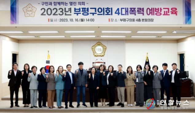 전국연합뉴스 박충곤 기자 | 인천시 부평구의회는 16일 직장 내 양성평등에 대한 건전한 가치관 함양 및 안전한 조직문화 조성을 위하여 전남숙 인천광역시 교육청 장학관을 초청해 의원 및 사무국 전 직원을 대상으로 4대폭력 예방교육을 실시했다.
