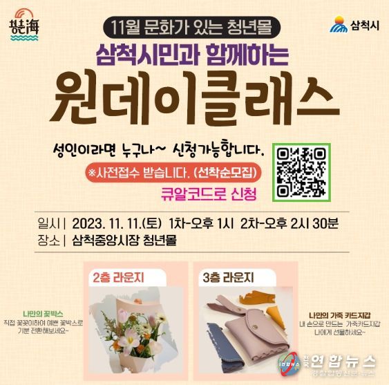 전국연합뉴스 권찬규 기자 | 삼척시가 오는 11월 11일 삼척중앙시장 청년몰에서 11월 문화가 있는 청년몰 행사로 “삼척시민과 함께하는 원데이 클래스”를 운영한다.