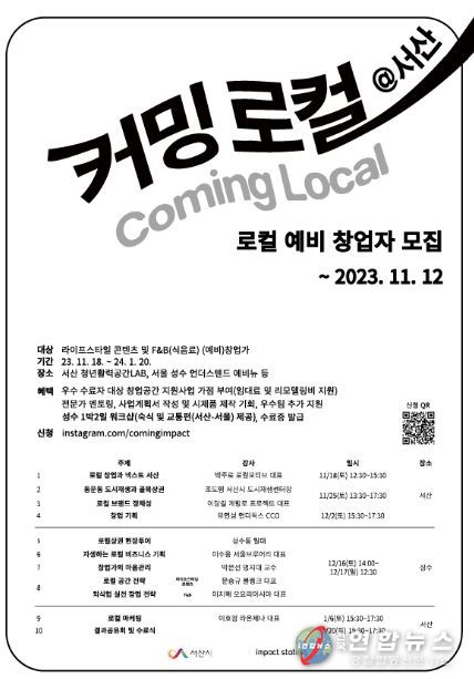 전국연합뉴스 김용태 기자 | 충남 서산시는 창업인 지원 프로그램인 ‘커밍로컬@서산’의 예비 창업자를 이번 달 12일까지 모집한다고 밝혔다.