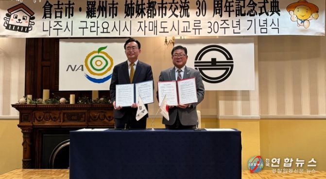 전라남도 나주시(시장 윤병태)는 지난 6일 일본 돗토리현 구라요시市(시장 히로타 카즈야스)에서 ‘나주시-구라요시시 자매결연 30주년 기념식’을 가졌다고 8일 밝혔다.
