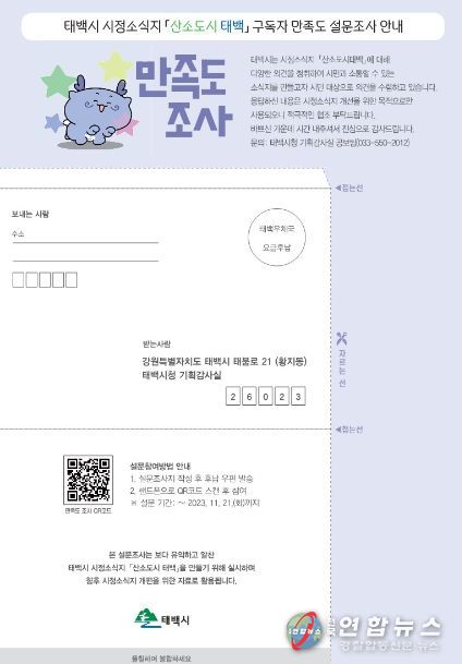 시는 이번 조사를 통해 시정소식지에 대한 선호도와 만족도를 파악하고 다양한 의견을 수렴하여 시정소식지 개편의 기초자료로 활용할 계획이라고 전했다. 참여 방법은 11월 시정소식지 산소도시 태백의 뒷면에 있는 설문조사지를 작성 후 가까운 우체통에 넣거나, 만족도조사 QR코드를 통해 참여 가능하다.