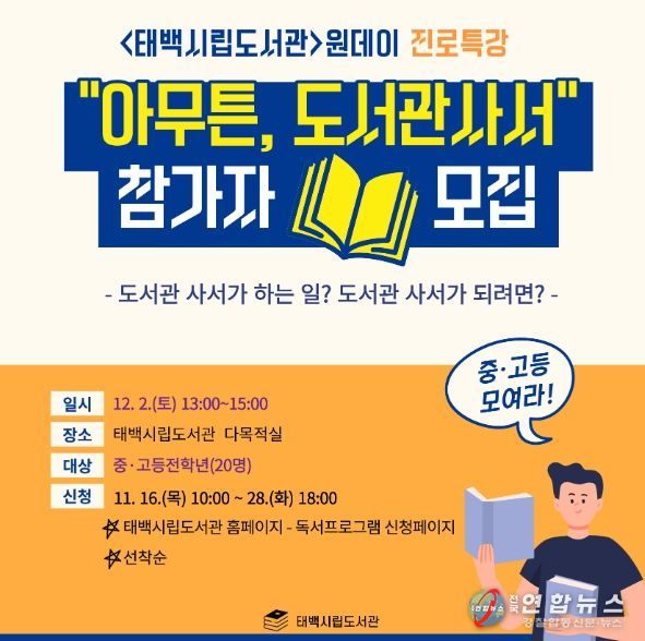전국연합뉴스 권찬규 기자 | 태백시는 오는 12월 2일 태백시립도서관에서 원데이 진로특강 “아무튼, 도서관 사서”를 개최한다고 전했다.