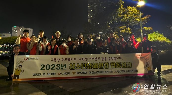 전국연합뉴스 김용태 기자 | 충남 서산시는 지난 16일 수능을 맞아 서산경찰서, 서산교육지원청, 청소년상담복지센터, 청소년유해환경감시단, 청소년을 사랑하는 모임 회원 등 60여 명이 합동으로 서산시 일원에서 청소년유해환경 점검 및 캠페인 활동을 펼쳤다고 밝혔다.