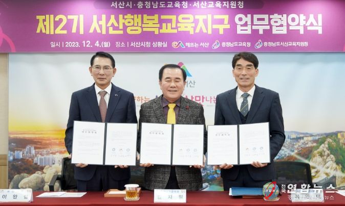 전국연합뉴스 김용태 기자 | 충남 서산시는 충남교육청, 서산교육지원청과 4일 서산시청 상황실에서 ‘제2기 서산행복교육지구 협약’을 체결했다고 밝혔다.