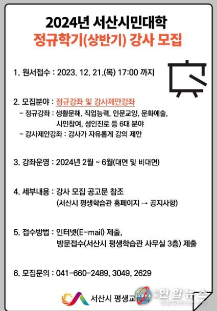 전국연합뉴스 김용태 기자 | 충남 서산시는 2024년 서산시민대학 상반기 정규학기를 이끌어갈 강좌별 강사를 21일까지 모집한다고 14일 밝혔다.