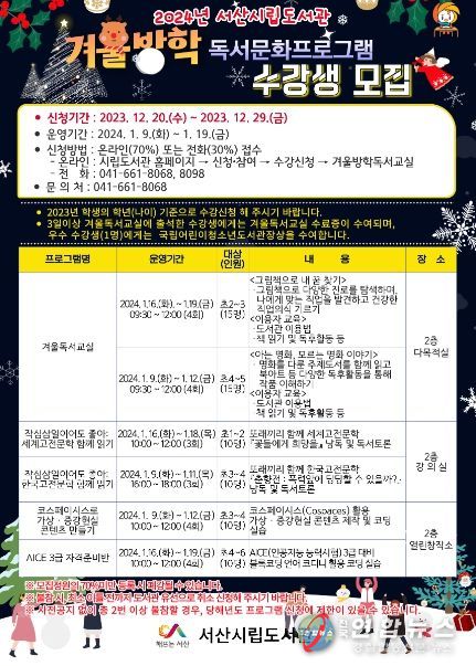 성기영 시립도서관장은 “학생들이 도서관과 함께 할 수 있는 다양한 독서프로그램을 통해 새로운 경험과 지식을 쌓고 친구들과 함께 독서의 즐거움을 나누며 소중한 겨울방학을 보내기를 바란다. 많은 참여를 부탁드린다”라고 밝혔다.