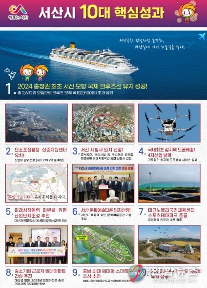 시가 선정한 10대 성과는 ▲국제크루즈선 유치 및 서산공항 건설 본격화 ▲시청사 입지 선정 ▲대산 그린컴플렉스 일반산단 및 대산충의 일반산단 승인 ▲일자리 연계형 지원주택 공모 선정 ▲2025 아시아 조류박람회(ABF) 유치 등이다