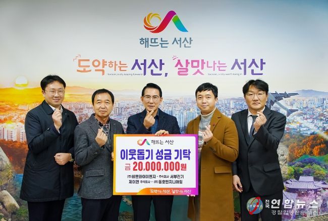 전국연합뉴스 김용태 기자 | 충남 서산시는 신재생에너지 융‧복합지원사업 참여업체 4개소가 26일 서산시에 어려운 이웃을 위해 써 달라며 2천만 원을 기탁했다고 밝혔다.
