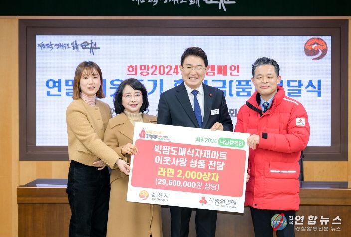 전국연합뉴스 김철환 기자 | 순천시는 지난 27일 순천 빅팜도매식자재마트(대표 장명희·김화영)에서 라면 2,000상자(2,960만 원 상당)를 후원하며 희망2024 나눔캠페인에 동참했다고 밝혔다.