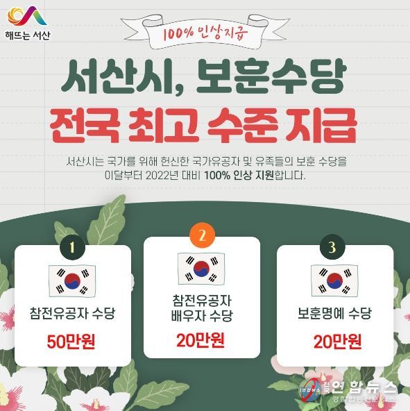 시는 이번 인상으로 민선8기 공약사항인 국가유공자 보훈수당 100%인상을 완료했다.