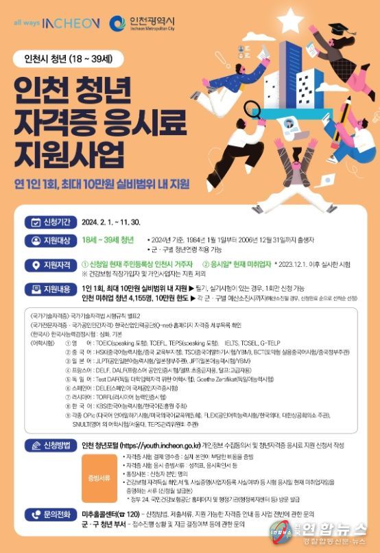 신청 기간은 오는 2월 1일부터이며, 인천청년포털을 통해 회원가입 후 응시 증빙서류와 결제영수증, 건강보험자격득실확인서, 사실증명(사업자등록확인), 본인 명의 통장 사본 등을 제출해야 한다.