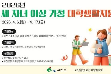 서천군, 세 자녀 이상 가정 대학생 생활지원금 지원