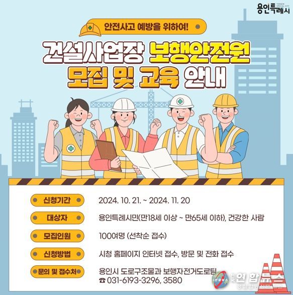 전국연합뉴스 배주현 기자 | 용인특례시는 건설사업장 주변을 통행하는 시민의 안전을 지키기 위해 내년부터 보행안전원을 투입키로 하고 21일부터 11월 20일까지 참가자 100명을 모집한다고 20일 밝혔다.