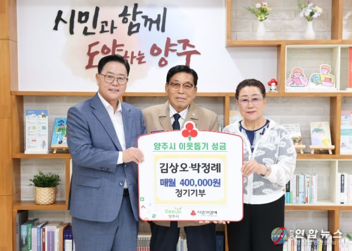 전국연합뉴스 박점규 기자 | 양주시는 20일, 참전유공자인 김상오(81)씨와 배우자 박정례(73)씨가 매월 40만원씩 이웃돕기 성금을 정기적으로 기탁하기로 약정했다고 밝혔다.