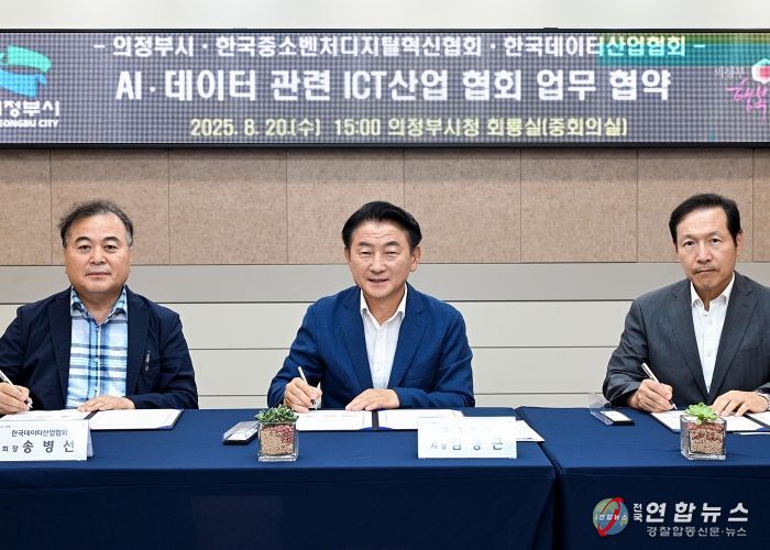 전국연합뉴스 박점규 기자 | 의정부시는 8월 20일 시청 회룡홀에서 한국중소벤처디지털혁신협회(회장 이영상), 한국데이터산업협회(회장 송병선)와 ‘데이터‧AI 기반 디지털 혁신산업 육성 및 기업 유치를 위한 업무협약’을 체결했다.