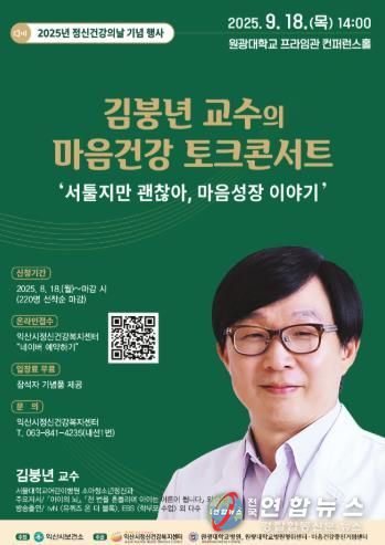 익산시는 정신건강의 날(10월 10일)을 기념해 오는 9월 18일 오후 2시, 원광대학교 프라임관에서 '마음건강 토크콘서트'를 개최한다고 21일 밝혔다.