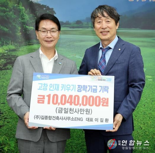 전국연합뉴스 최성용 기자 | ㈜길종합건축사사무소ENG가 지난 25일 오후 고창군장학재단에 1004만원의 장학금을 기탁하며 고창군 학생들의 학업과 성장을 응원했다.