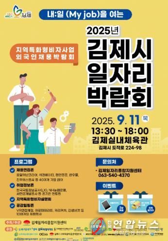전국연합뉴스 김현호 기자 | 김제시는 김제일자리종합지원센터 주관으로 오는 9월 11일 김제실내체육관에서 내:일(My job)을 여는 ‘2025년 김제시 일자리박람회’를 개최한다고 밝혔다.