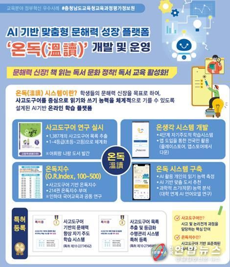전국연합뉴스 기자 | 충남교육청은 2025년 교육분야 정부혁신 우수사례 경진대회에서 충남교육청 우수사례 ‘인공지능(AI) 기반 맞춤형 문해력 성장 플랫폼 '온독(溫讀)' 개발 및 운영’이 시도교육청 분야 1위 “대상”으로 선정됐다고 밝혔다.
