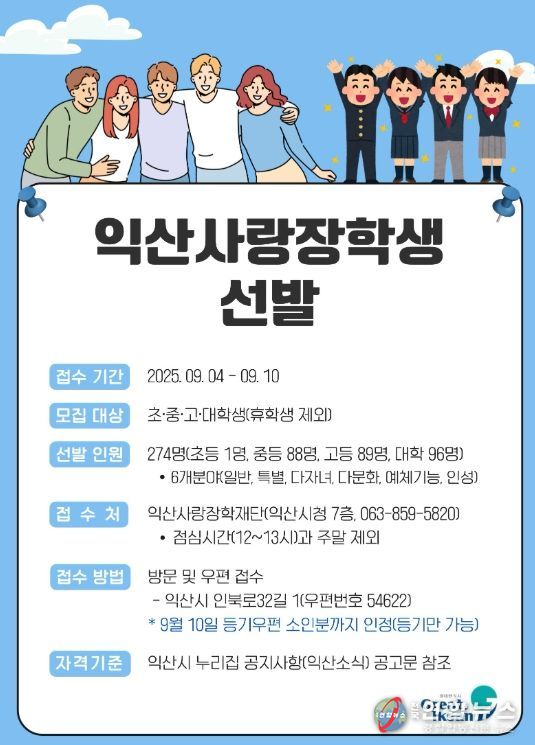 익산시는 (재)익산사랑장학재단이 오는 9월 4일부터 10일까지 2025년도 '익산사랑 장학생'을 모집한다고 26일 밝혔다.