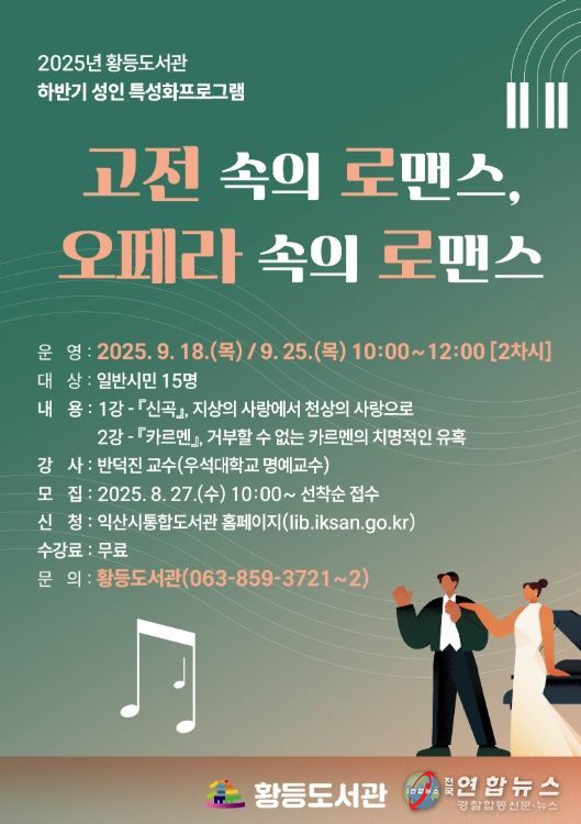 익산시는 황등도서관에서 오는 9월 18일과 25일, 성인 특성화 프로그램 '고전 속의 로맨스, 오페라 속의 로맨스'를 운영한다고 26일 밝혔다.