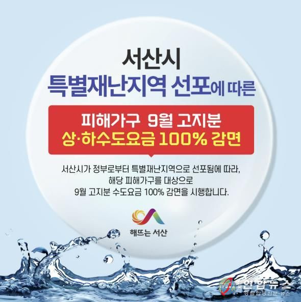 전국연합뉴스 김용태 기자 | 충남 서산시가 집중호우 피해를 본 가구의 9월 고지분 수도 요금을 전액 감면한다고 밝혔다.