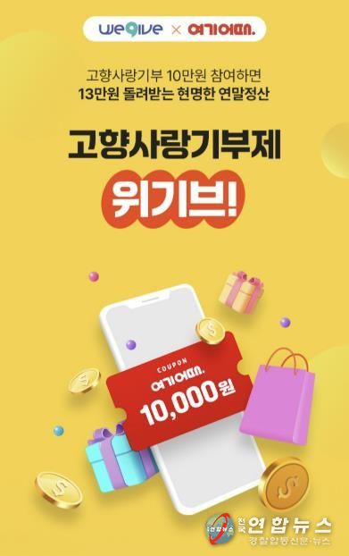 고향사랑e음, 민간플랫폼 ‘위기브’, 전국농협 등을 통해 진행 중이며, 민간 플랫폼 위기브를 통해 10만 원 이상을 기부하면 여행 플랫폼 ‘여기어때’에서 활용할 수 있는 1만 원 쿠폰이 제공된다.