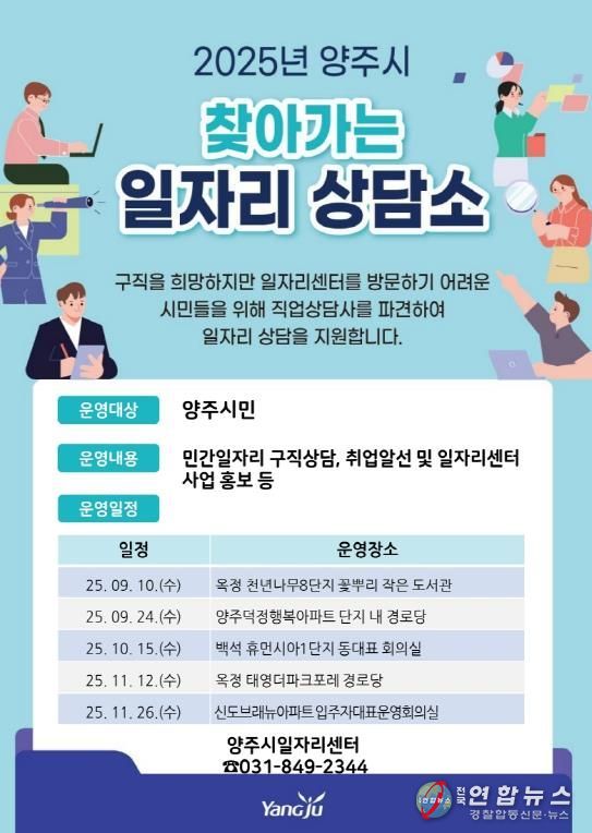 전국연합뉴스 박점규 기자 | 양주시가 구직 의사가 있으나, 일자리센터 방문이 어려운 시민들을 위해 담당 공무원과 전문 직업상담사가 직접 찾아가는 현장 맞춤형 취업 상담 서비스인 '찾아가는 일자리 상담소'를 하반기에도 운영한다고 밝혔다.