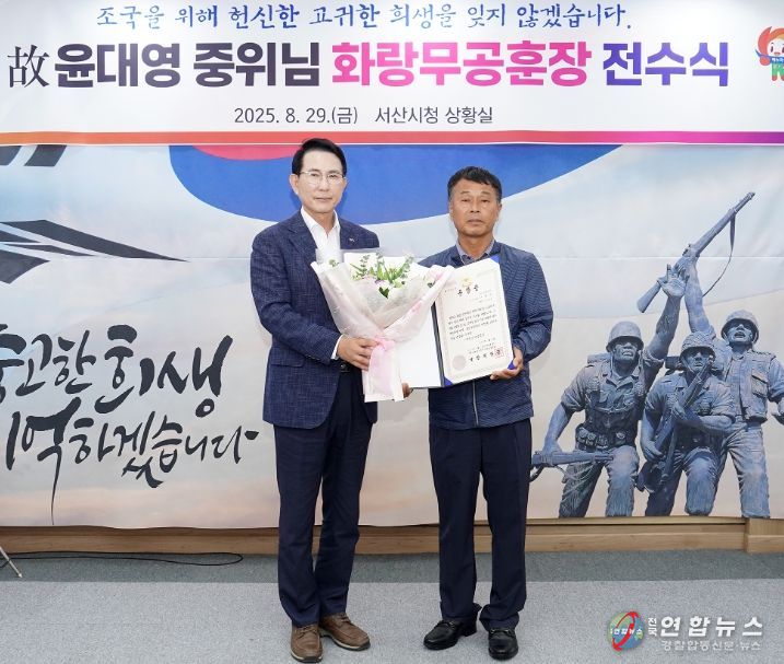 전국연합뉴스 김용태 기자 | 충남 서산시는 29일 시청 상황실에서 6.25 참전유공자 고(故) 윤대영 중위의 화랑무공훈장증 전수식을 개최했다고 밝혔다.