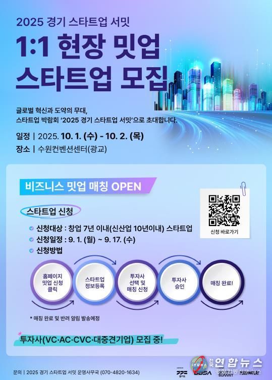 전국연합뉴스 조민준 기자 | 경기도와 경기도경제과학진흥원은 오는 10월 1일부터 2일까지 수원컨벤션센터에서 개최되는 ‘2025 경기 스타트업 서밋(G-SUMMIT 2025)’의 핵심 프로그램 ‘1:1 현장 밋업(Meet-up)’ 참가 스타트업을 9월 17일까지 모집한다.