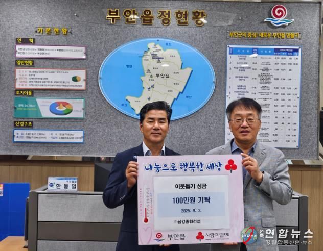 전국연합뉴스 김현호 기자 | ㈜남강종합건설은 지역사회 나눔 실천의 일환으로 지난 2일부안읍 이웃돕기 성금 100원을 기탁했다.