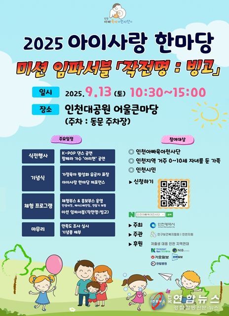 전국연합뉴스 박우배 기자 | 인천광역시는 인천시와 인구보건복지협회 인천지회가 공동 운영하는 인천아빠육아천사단이 주관하는 ‘2025 아이사랑 한마당, 미션 임파서블’ 행사가 오는 9월 13일 오전 10시 30분부터 오후 3시까지 인천대공원 어울큰마당에서 열린다고 밝혔다.