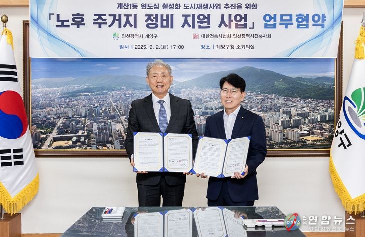 전국연합뉴스 박말출 기자 | 인천광역시 계양구와 인천광역시건축사회(회장 김영철)는 2일 ‘계산1동 노후주거지 정비 지원사업’의 성공적 추진을 위해 업무협약을 체결했다.