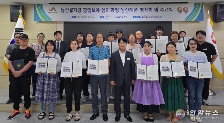 전국연합뉴스 김용태 기자 | 서산시는 지난 9월 4일 '농산물가공 창업보육 심화과정'을 마치며 교육생들이 직접 만든 농산물 가공 시제품에 대한 품평회 및 수료식을 개최했다.