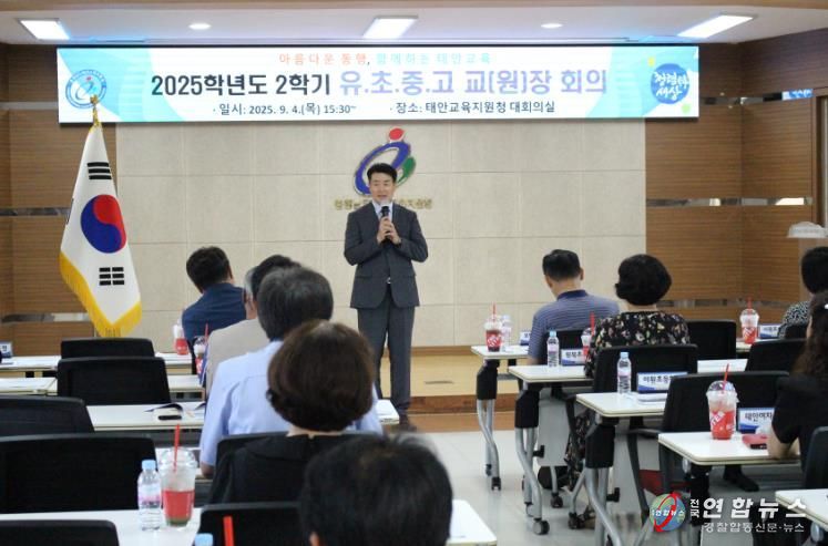 전국연합뉴스 기자 | 충청남도태안교육지원청은 지난 4일 태안교육지원청 대회의실에서 지원청 담당자를 포함한 관내 유‧초‧중‧고 교장(원장) 60명이 참석한 가운데 ‘2025학년도 2학기 유‧초‧중‧고 교장(원장) 회의’를 개최했다.