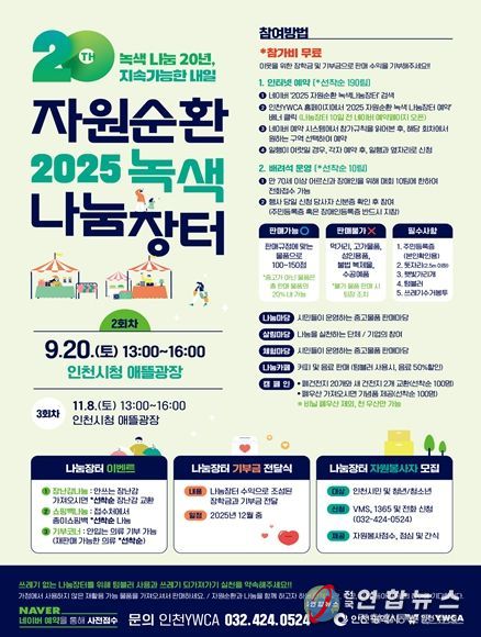 전국연합뉴스 박우배 기자 | 인천광역시는 시민들의 탄소중립 실천과 나눔 문화 확산을 위해 인천시가 주최하고 인천YWCA가 주관하는 ‘2025 자원순환 녹색 나눔장터’를 오는 9월 20일 애뜰광장에서 개최한다고 밝혔다.